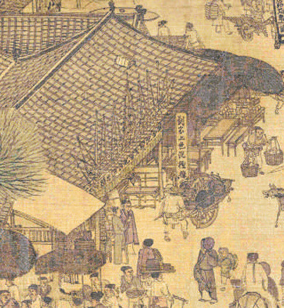 r以“汴京富丽天下无”来概括北宋东京的繁荣与富庶,并不过分。《东京梦华录》曾记载,在东京城的酒店中二人对坐饮酒,就需要“注碗一副、盘盏两副、果菜碟各五片、水菜碗三五只”。而东京城中,汇聚了百工精巧,无所不有。这些在大相国寺中有集中的体现。大相国寺是东京城内著名的佛教大寺,又是东京城内“万姓交易”的场所,每月开放8次,各种日常用品、金银首饰以至书籍碑帖、文房笔墨,都可以在寺中购得。李清照在《金石录·后序》中曾回忆北宋末年她和赵明诚从大相国寺购买碑文后,回到家中展玩对读。可见,以大相国寺为中心形成了一个繁华的商业区,成为官民士庶出入频繁的活动中心,拜佛上香、观光娱乐、庙会集市、时令游赏,无所不有。